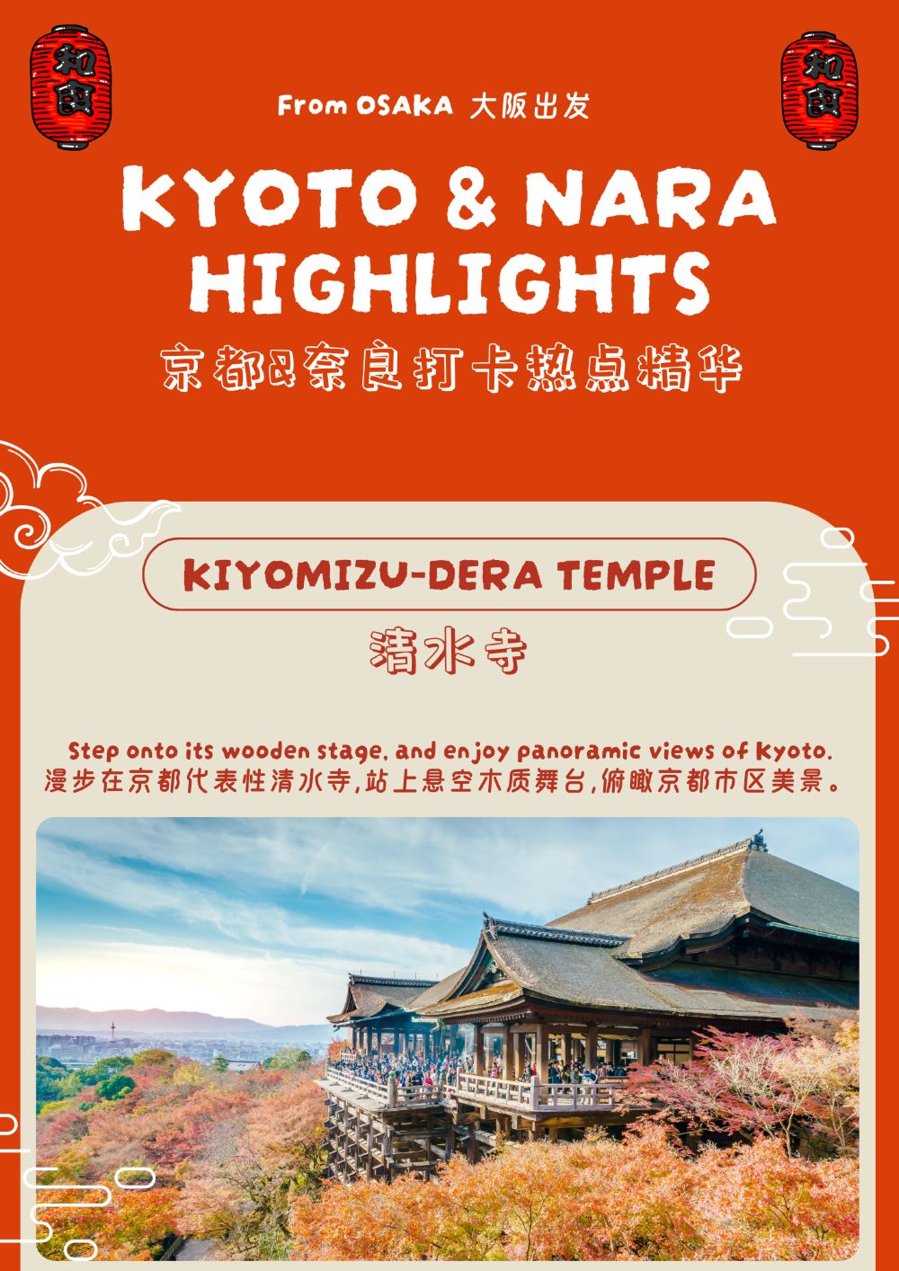 - 俯瞰京都全景 | 站在清水寺木質舞台上,俯瞰京都四季變換的美景,感受千年古剎的莊重氛圍與歷史氣息。