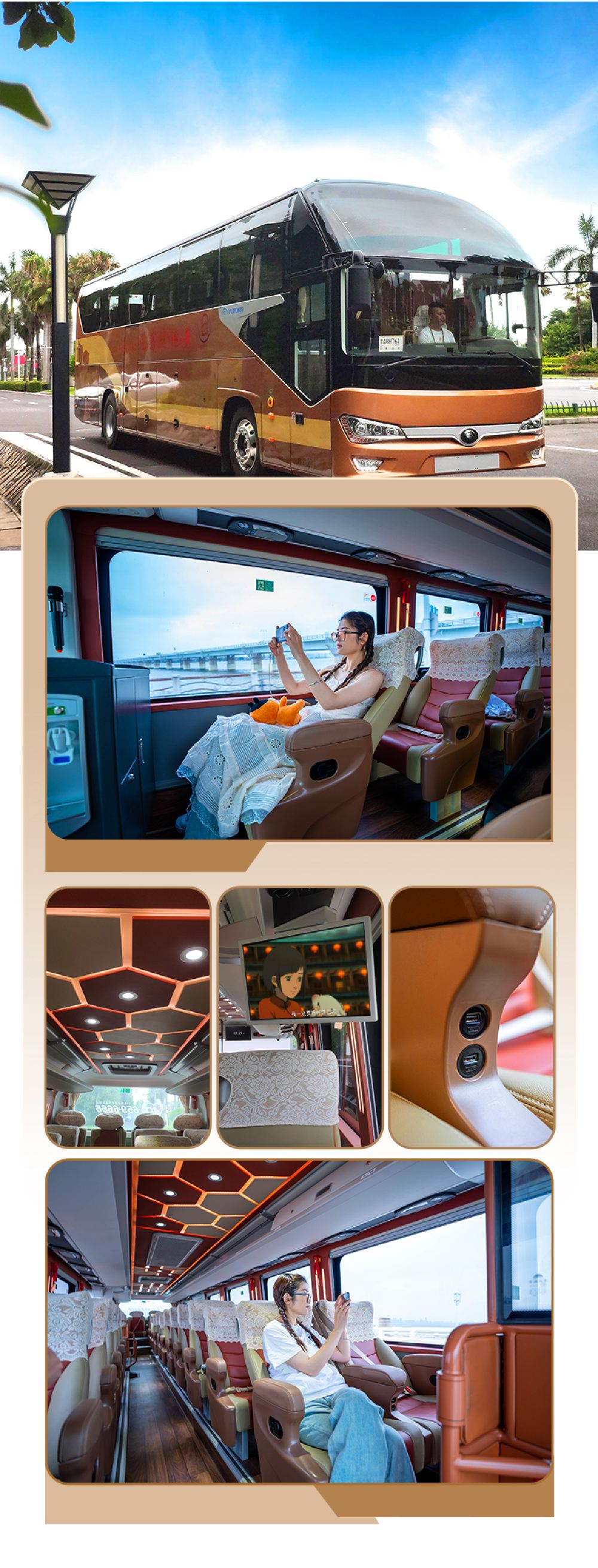 35人團:頭等艙航空座椅,2+1寬體旅遊巴士,每座均配備 USB 充電接口。座椅具備 125 度半躺多功能調節功能。