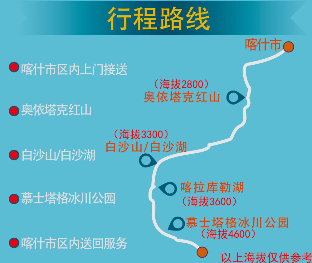 2、此行程景區景點位於帕米爾高原,冰川海拔4688米,恕不接待3歲以下及69歲以上的遊客,亦不接待孕婦、患有心臟病或哮喘等疾病的遊客,敬請諒解!