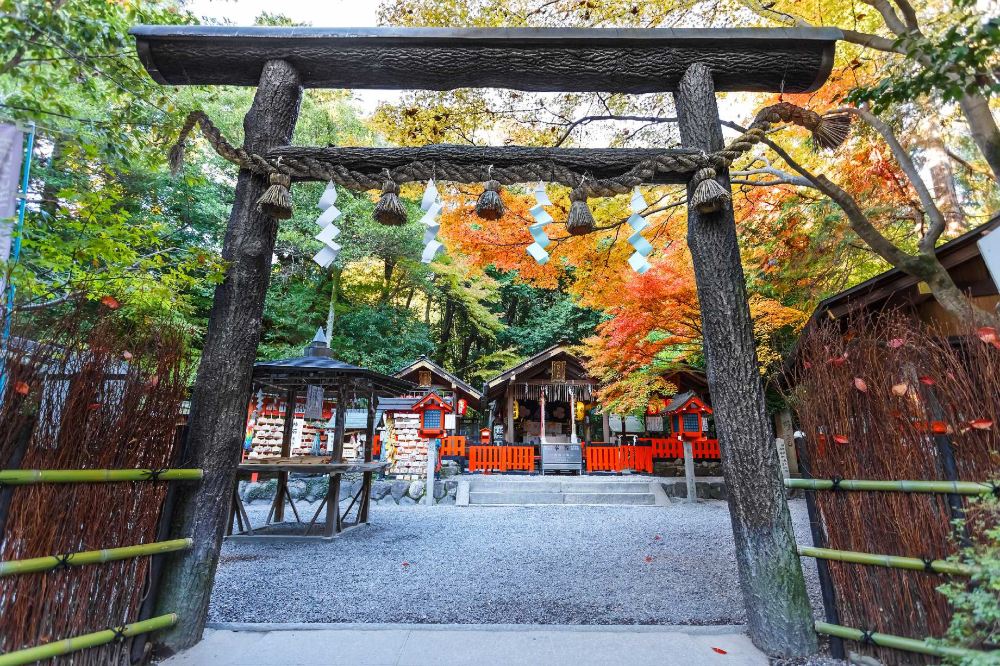 觸摸黑木鳥居的粗獷紋理,在《源氏物語》眷戀過的神域求一枚戀愛御守。返回指定地點