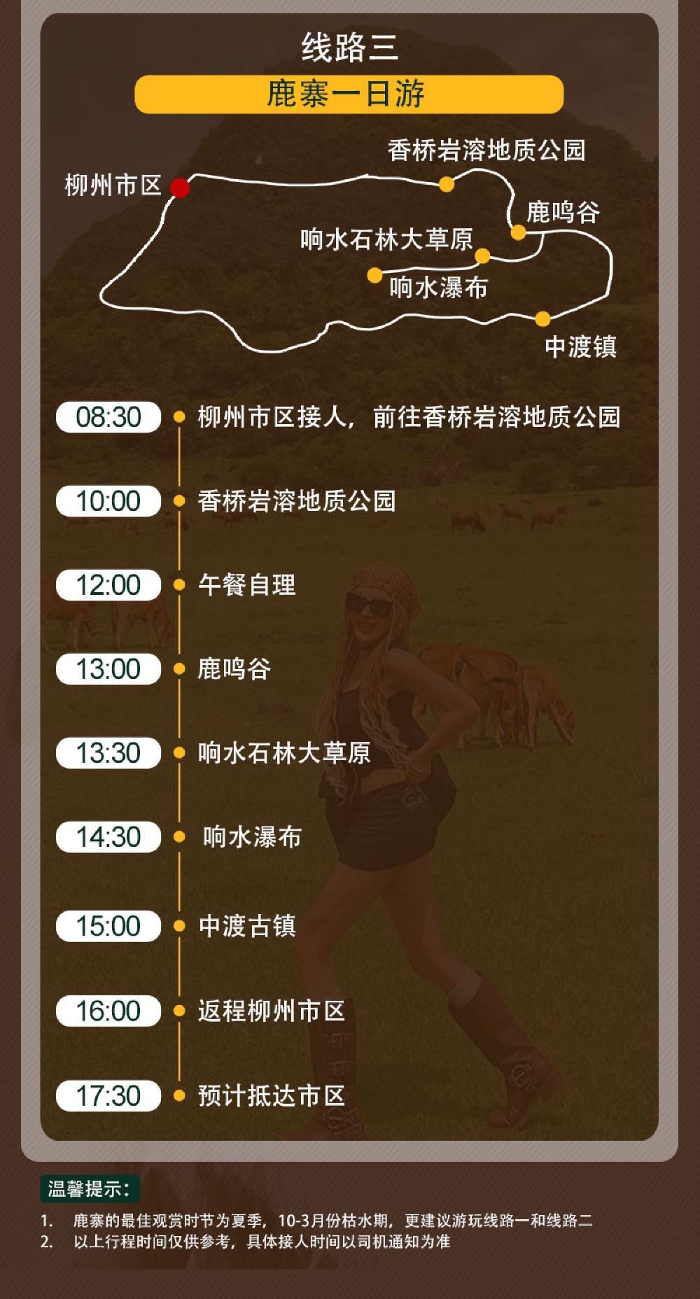 A-香+鹿+響石+響瀑|鹿寨一日遊 | 標準車型(5座) | 普通話 | 提供去程接送 | 拼團 | 6位旅客 | 只提供司機 | 不包括餐膳 | 回程接送