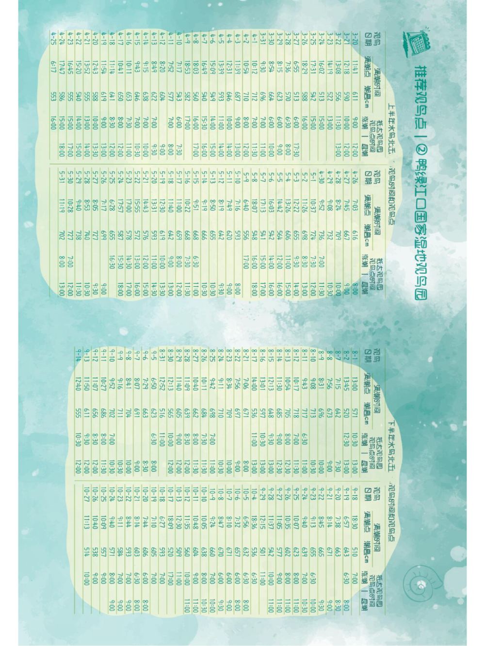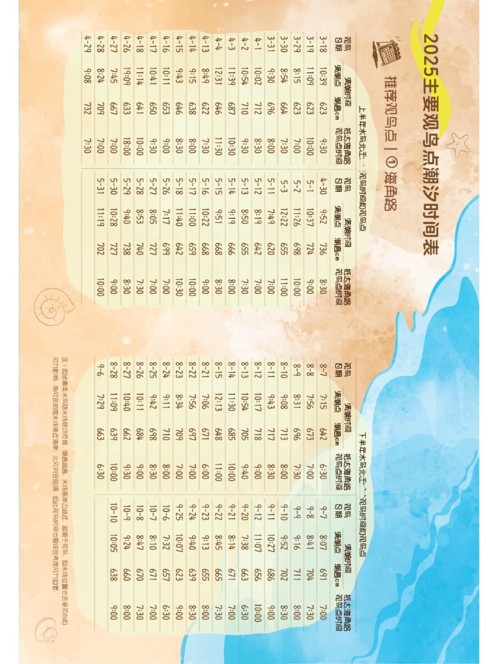 ▲ 2026年春季丹東-東港適宜觀賞鳥浪的日期和時間。推薦觀鳥浪的日期是:2026年3月20日-25日,4月2日-7日,4月17日-23日,4月30-5月7日。這幾個時間段是遷徙鴴鷸的高峰期,老少咸宜。 過了高峰期的5月15-22日,感興趣的發燒友可以在此期間繼續。 此路線受潮水影響較大,每天發車時間不一樣,請提前確認好發車時間