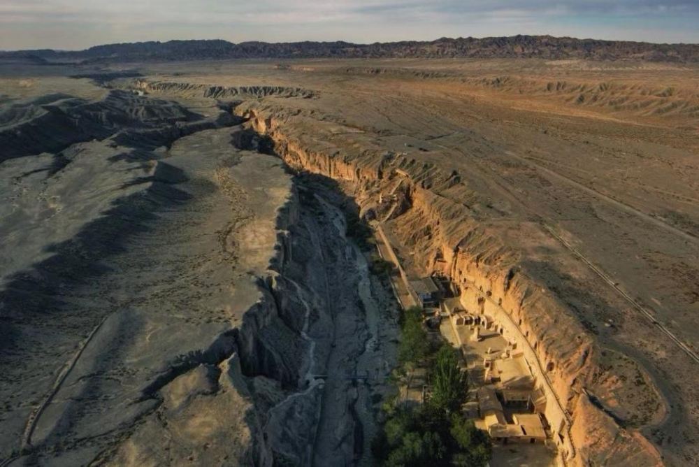 ▲ 從高空俯瞰,榆林窟猶如一顆遺珠,鑲嵌在戈壁的巨大褶皺裡。河水切割出的峽谷,守護著千年的壁畫與文明。
