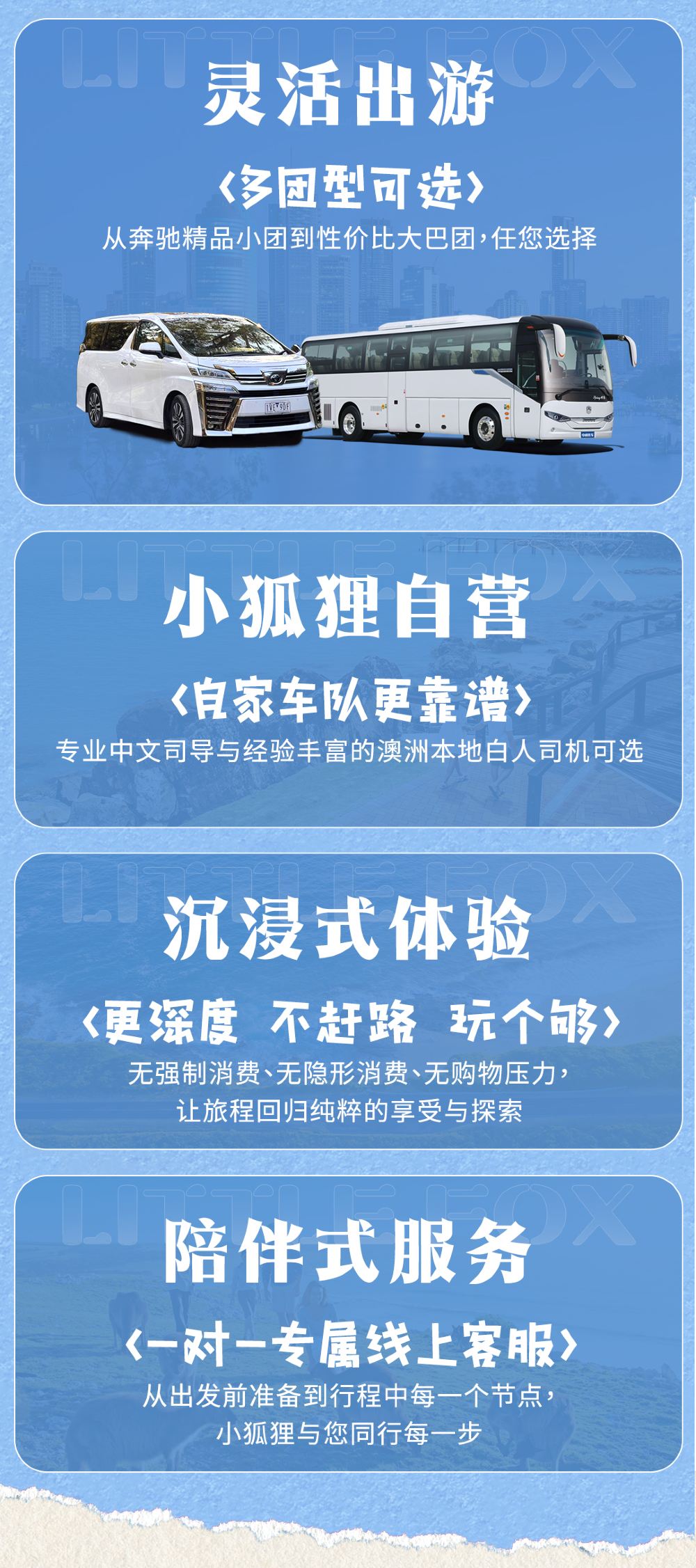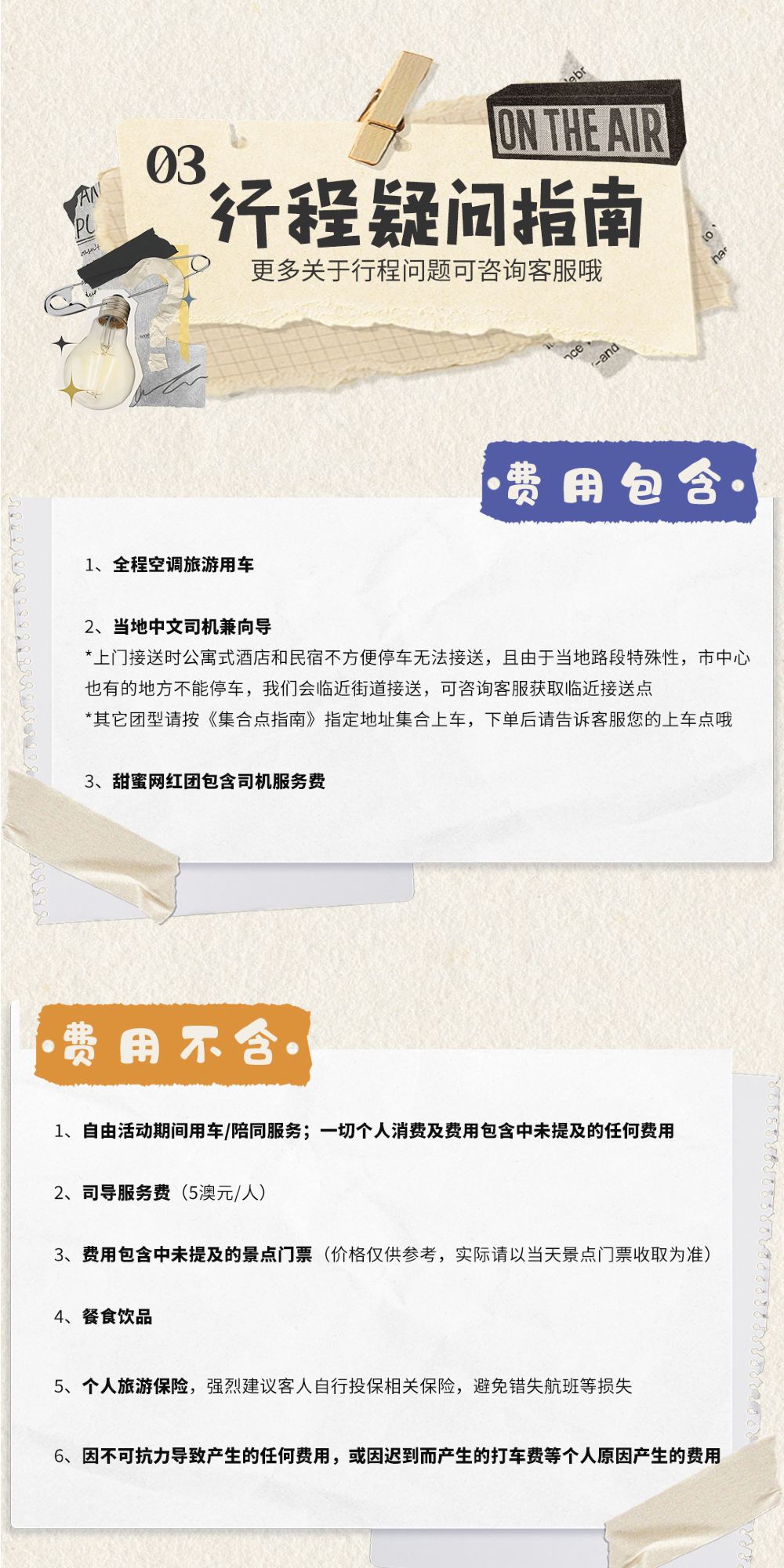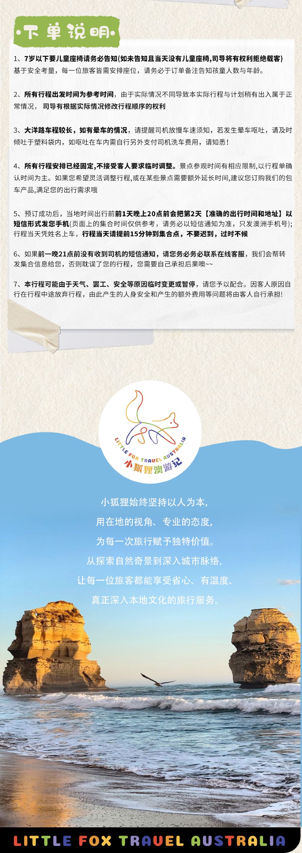 接送出發時間為8:00前,根據實際出團安排為準,請提前15分鐘到達指定地點等候上車,超時5分鐘則視為自動取消,費用不退。接受免費接送範圍僅限市區CBD郵遞區號3000、3001、3002、3003、3004、3005、3006以及Box Hill 3128,其他範圍地區酌情收費。市區範圍內3/4/5星級酒店皆可免費接送,但公寓式酒店和民宿因道路問題不方便停車不能接送,具體請下單諮詢客戶服務支援。景點活動