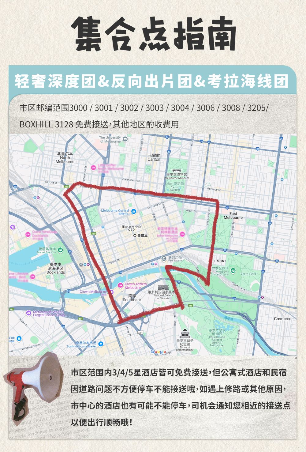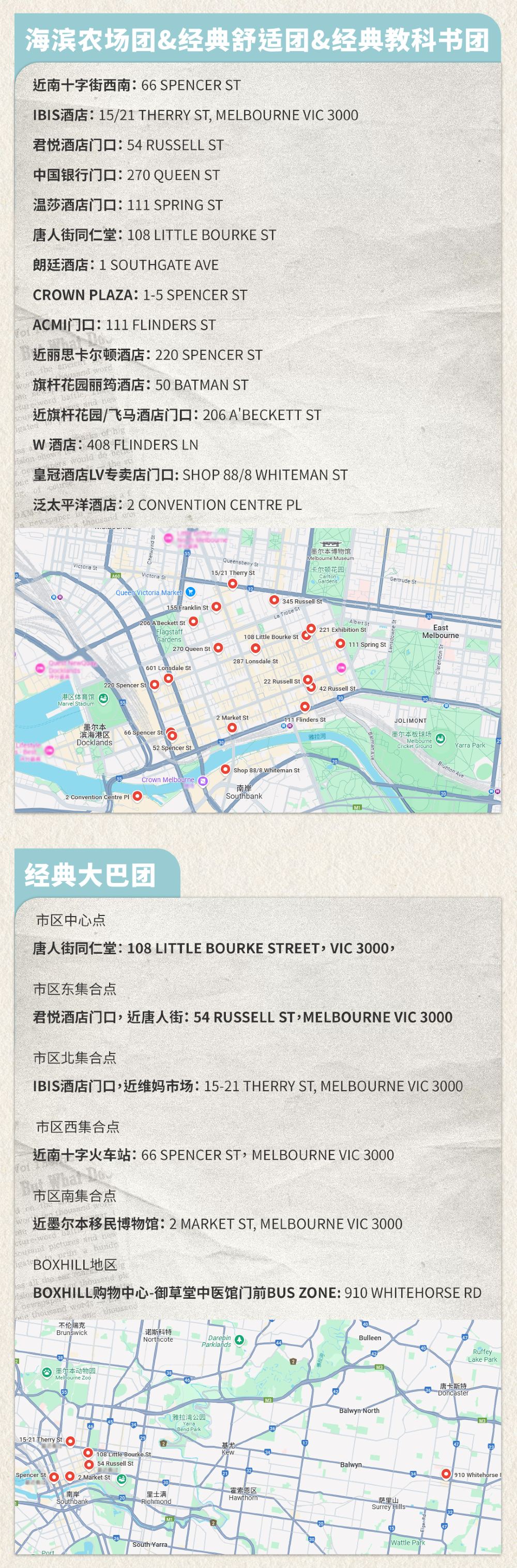 市中心點 唐人街同仁堂:108 LITTLE BOURKE STREET, VIC 3000,市中心東集合地點 君悅酒店門口,近唐人街:54 RUSSELL ST, MELBOURNE VIC 3000 市中心北集合地點 IBIS酒店門口,近維媽市場:15-21 THERRY ST, MELBOURNE VIC 3000 市中心西集合地點 近南十字火車站:66 SPENCER ST, MELBOURNE VIC 3000景點活動