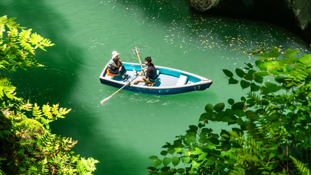 ▲ 高千穗峽谷|秋日的高千穗峽,紅葉漫山遍谷,清澈的溪水倒映層林,瀑布飛流直下,彷彿把秋色點綴得更為靈動。真名井瀑布自17米熔岩斷崖傾瀉,水霧漫過青苔岩柱,每一幀都是自然雕琢的浮世繪(一艘遊船可以乘坐3人)