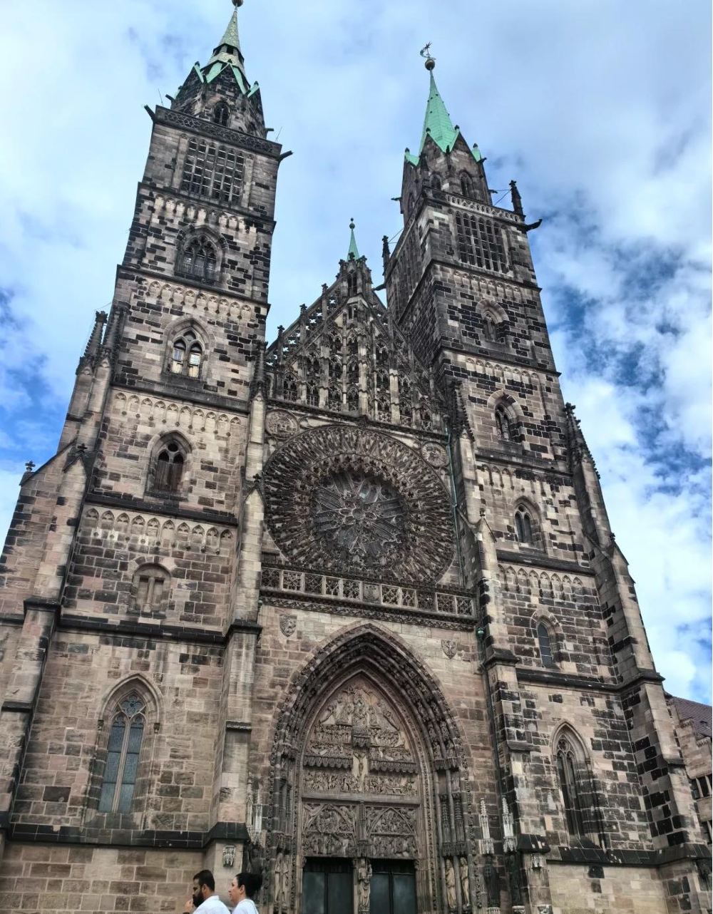 ▲ 紐倫堡聖母教堂氣勢恢宏,雙塔高聳入雲,塔頂泛著綠意。外牆石磚斑駁,精美的雕刻與巨大的玫瑰窗相互輝映。藍天白雲為背景,凸顯其哥特式建築的雄偉壯麗,令人心生敬畏。