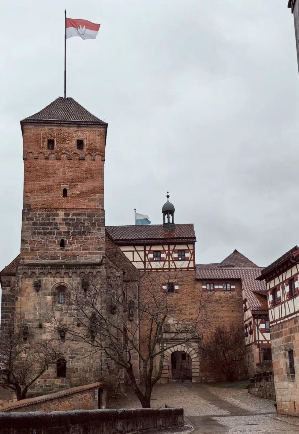 ▲ 紐倫堡城堡的塔樓巍峨聳立,紅磚與石塊交錯,盡顯堅固與滄桑。屋頂線條硬朗,旗幟隨風飄揚。周圍樹木枝幹虯曲,在陰沉天空下,更顯城堡的莊嚴肅穆,彷彿在訴說往昔的輝煌與故事。