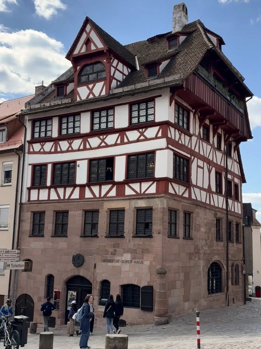 ▲ 阿爾布雷希特・丟勒故居,木筋牆結構獨具特色,紅白相間的色調古樸雅緻。磚石基座沉穩厚重,窗戶排列整齊。門前行人往來,在藍天白雲的映襯下,瀰漫著濃厚的藝術氣息與歷史韻味。