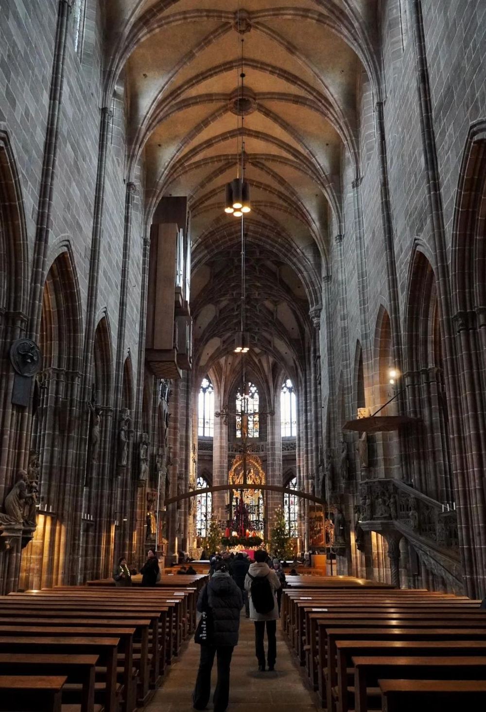 ▲ 步入紐倫堡聖母教堂內部,高大的拱形結構氣勢磅礴,石柱排列整齊。暖黃燈光柔和灑落,長椅有序擺放。人們靜靜漫步,彩色玻璃窗透進微光,營造出神聖而靜謐的氛圍。