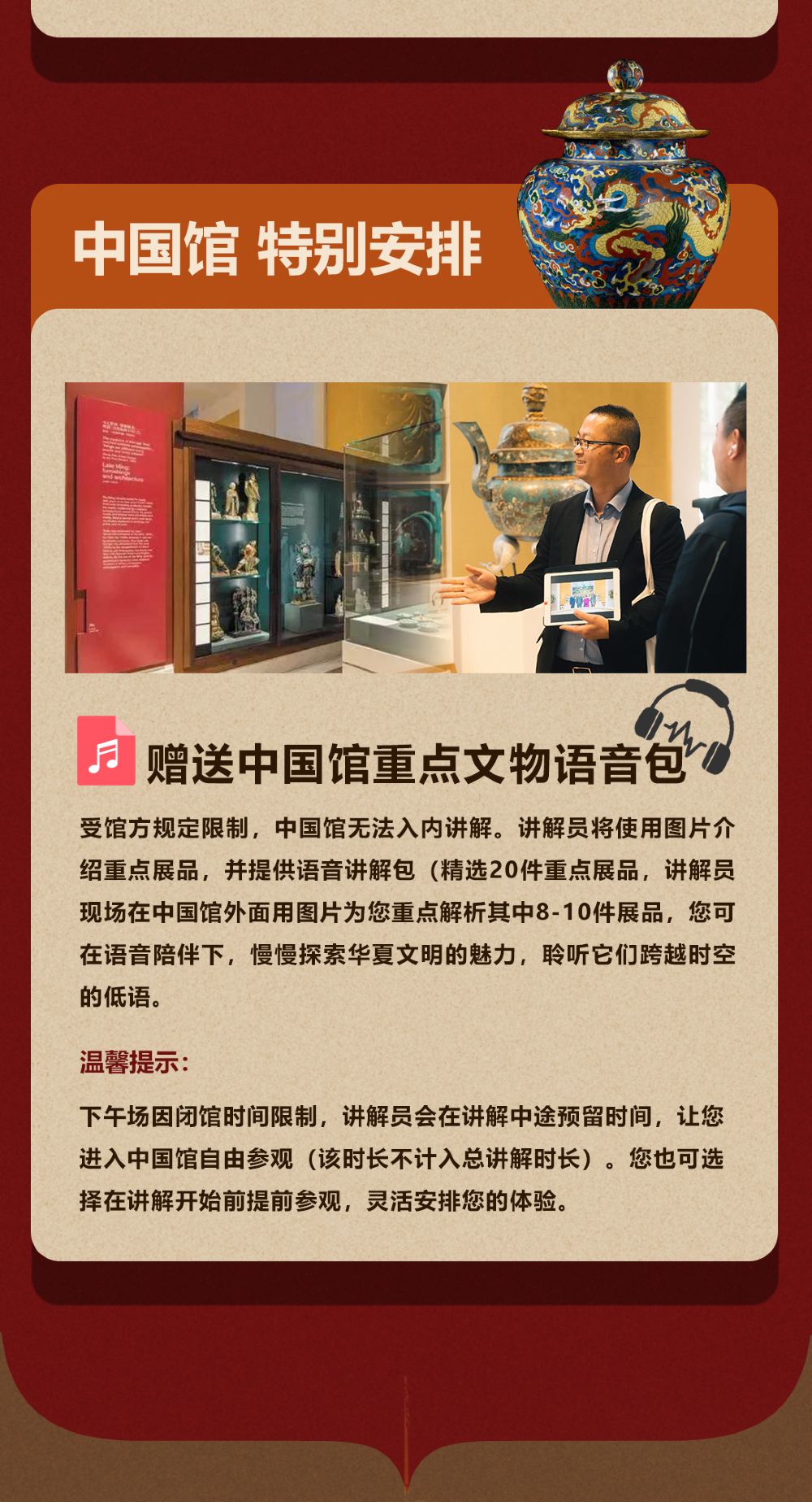- 體驗感滿分:贈送中國館重點文物語音講解包,支持當天接單/免費改期/提前退款!