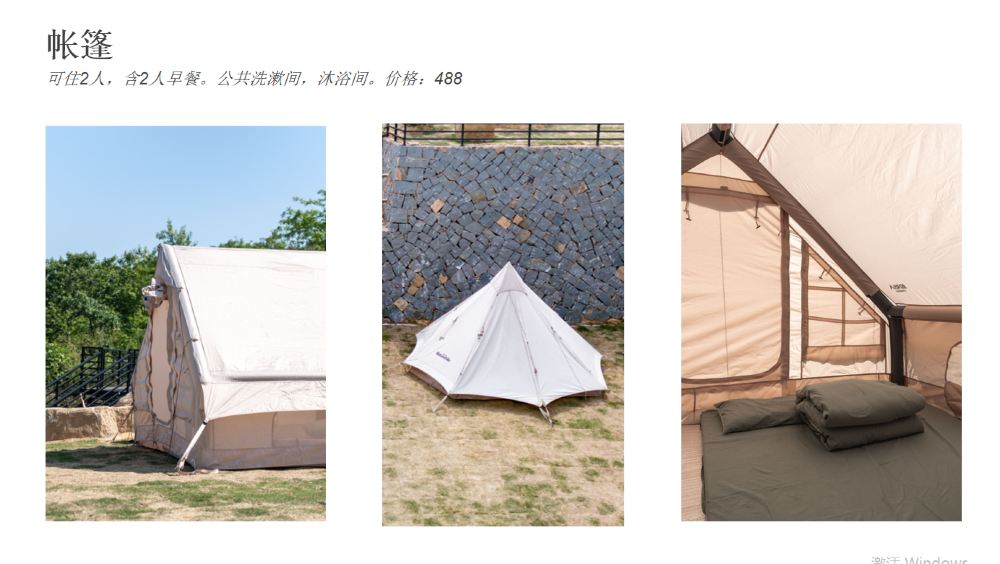 - 帳篷套餐(488元/晚):雙人專屬小天地,伴著蟲鳴入眠,清晨還有暖心早餐喚醒味蕾,氛圍感直接拉滿!