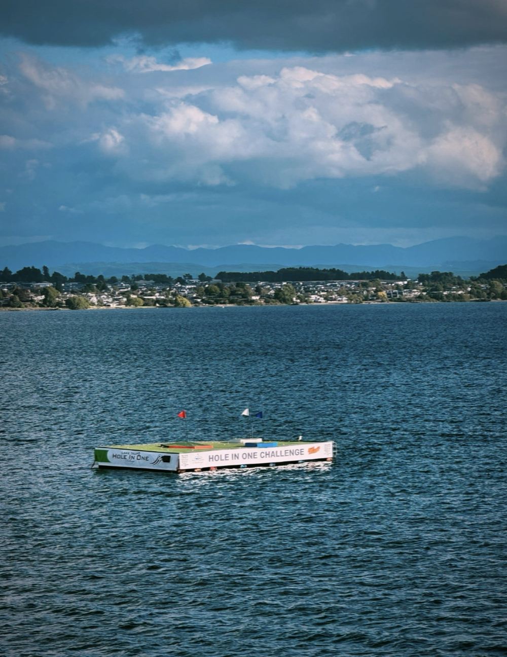 ▲ 在廣闊的湖面上,「一桿進洞挑戰(Hole in One Challenge)」漂浮平台宛如一片獨特的孤島。平台在湖水的簇擁下微微晃動,好似在向天空與湖水展示著獨屬於它的挑戰魅力。遠處,山巒連綿起伏,與低垂的雲層相接,似一幅天然的水墨長卷,給這場水上挑戰增添了幾分神秘與豪邁,彷彿在訴說著每一次揮桿都是人與自然的激情對話。