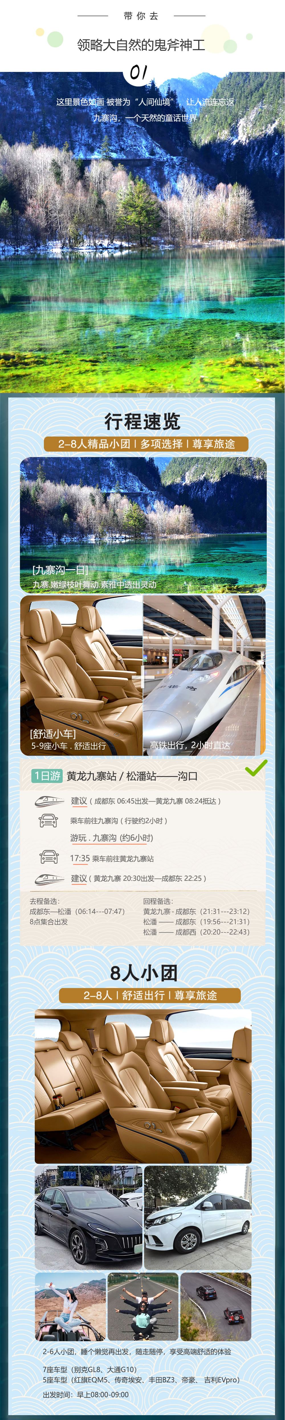 1、去程需買:成都東-黃龍九寨(06:45---08:24)8點45集合 2、回程優先買:黃龍九寨-成都東(20:30—22:25) 備選1:黃龍九寨-成都東(21:31---23:12) 備選2:松潘-成都東(19:56---21:31) 備選3:松潘-成都西(20:20---22:43) 交通