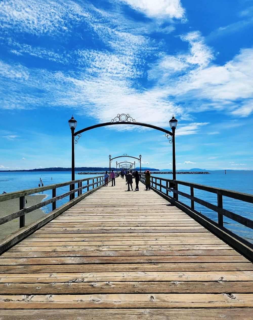 ▲ 白石鎮位於大溫哥華地區南端,三面被素里市包圍,南臨森美亞姆灣,距溫哥華市中心約45公里,車程1小時,鄰近美加邊境。鎮名源自海邊一塊巨大白色冰磧石,因海鳥排泄和定期刷漆而保持潔白。地標是建於1914年的白石棧橋,長470米,可免費步行至橋尾觀海、看日落或垂釣。鎮內2.5公里弧形沙灘沙質細軟,夏季適合戲水、沙灘排球,冬季可見冰霜奇景;主街(Marine Drive)臨海岸分佈餐廳、咖啡館