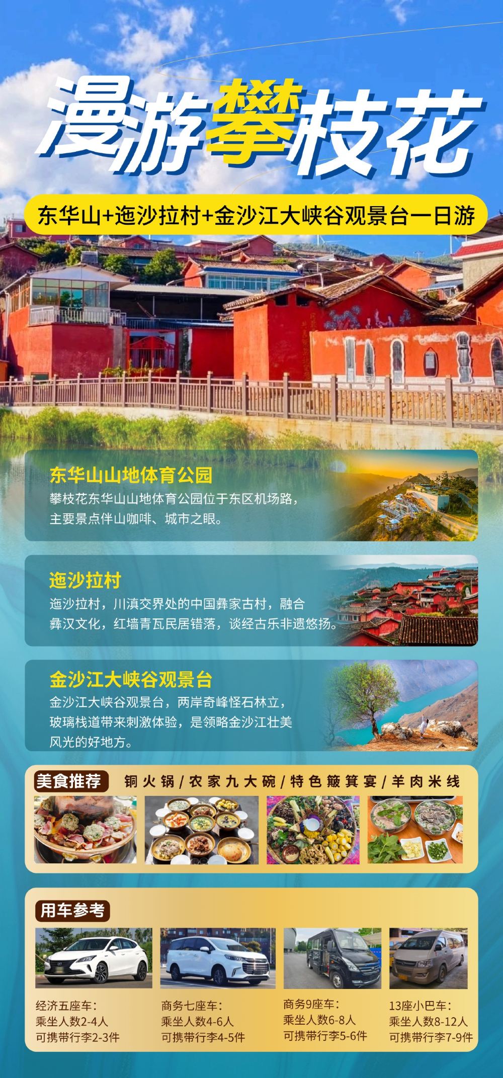 B-東華山-迤沙拉+金沙江7座車 | 經濟型7座 | 普通話 | 提供去程接送 | 獨立包團 | 4位旅客,可升級至6位旅客(需額外收費) | 只提供司機 | 不包括餐膳 | 回程接送