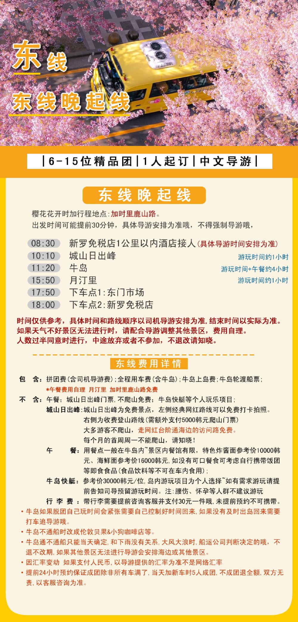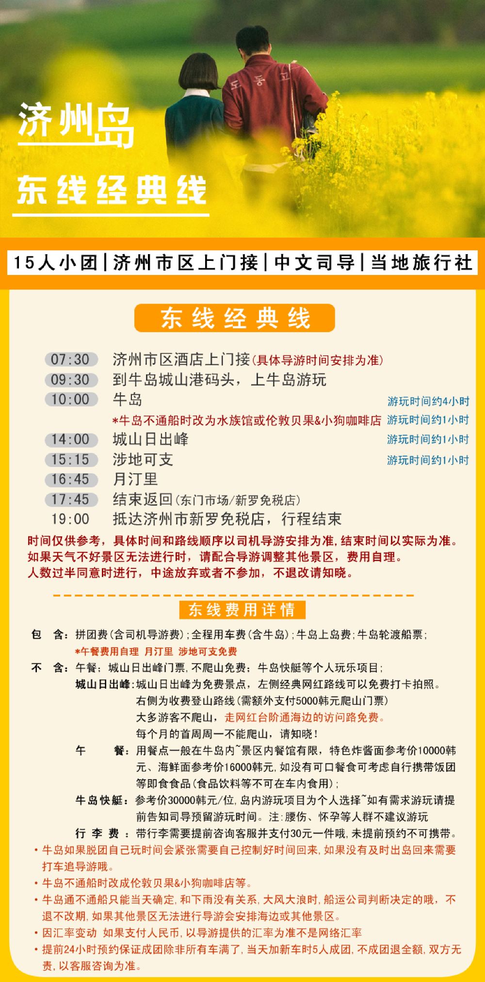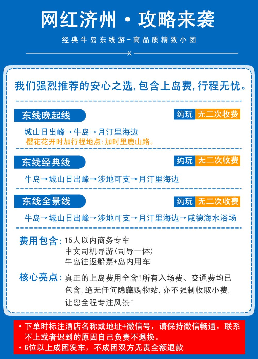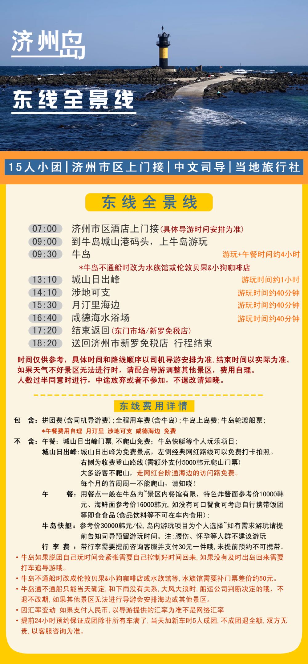 新羅免稅店1公里以內酒店1位起接,其他地區自行到新羅免稅店集合 下單時標註酒店名稱或地址+WeChat號,請保持電話和WeChat暢通,聯繫不上商家客戶服務支援或遲到的原因概不退換。 注意:6位以上成團,不成團退全額,行程前一天22:00之前安排早上出發時間,東線牛島預設包車上島! 如有同行的夥伴分開下單須告知,未告知導致沒有安排到一起,不以此為由退改。交通
