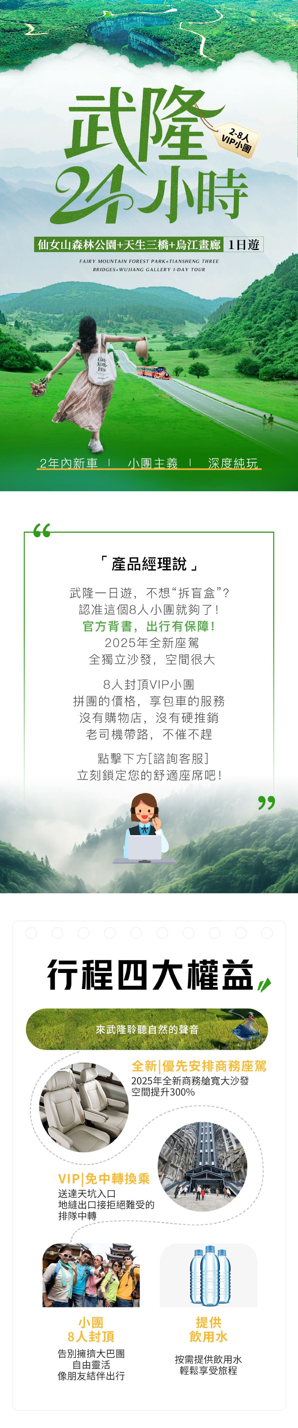 A-8人小團:外賓下單+配人工翻譯 | 小巴(9座位) | 英文 | 提供去程接送 | 拼團 | 8位旅客 | 只提供司機 | 不包括餐膳 | 回程於指定地點解散 | 武隆天生三橋·遊玩項目-觀光電梯 (80米)/中轉車(遊客中心-入口/出口-遊客中心)