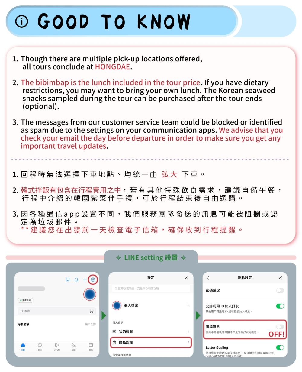 ▲ 本行程所附為基本人身保險,僅於發生重大人身事故時適用,建議旅客自行加保旅遊保險,以獲得更全面保障。行程所用接送車輛將依參加人數安排:1至3人使用Solati或Starex小型車,14人以上將安排中型巴士。本行程為共乘型態,並非私人包車服務,敬請理解。 導遊語言將依預約狀況安排,以中文或英文為主。如預約人數已滿或未達特定語言成團人數,導遊語言將視情況調整,恕不另行通知。