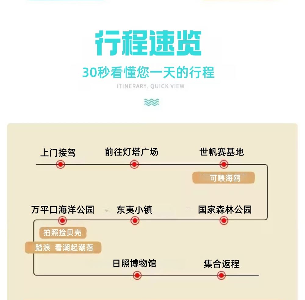 於指定地點接載08:00 日照 東港區 於指定地點接載 【溫馨提示】工作人員會在出發前一天19點前與客人聯繫,請保持電話暢通,如未聯繫請及時聯繫客戶服務支援。 【接送範圍】日照市區各酒店,南至天津路,西至兖州路,北至森林公園,具體時間以導遊通知為準。 【備註】如遊客所住賓館超出指定區域我司不提供上面接送服務,客人可自行打車前往與導遊在約定地點匯合。南至天津路,北至森林公園,西至兖州