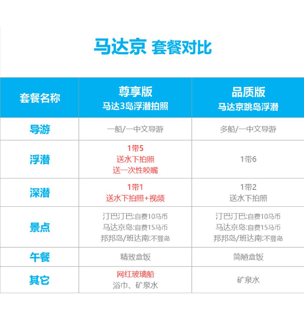 B-尊享 馬達京跳島 深潛+影片 | 普通話 | 於集合地點集合 | 拼團 | 37位旅客 | 普通導遊 | 包括午餐 | 回程於指定地點解散