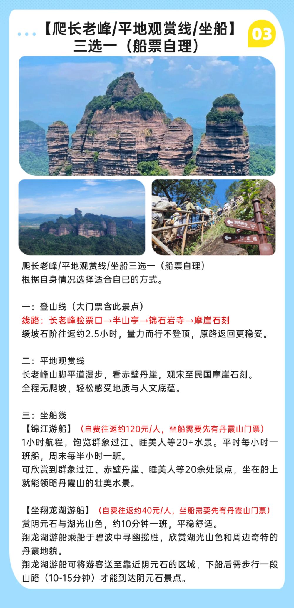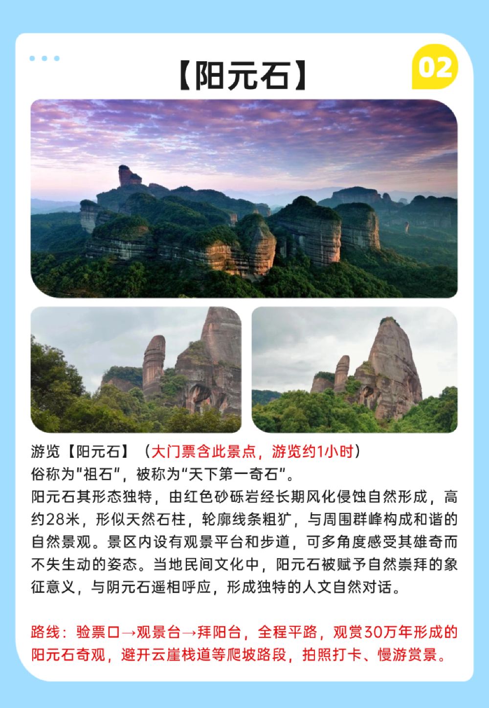 - 深度暢遊:世界自然遺產、國家5A級景區、中國紅石公園、世界丹霞命名地-丹霞山