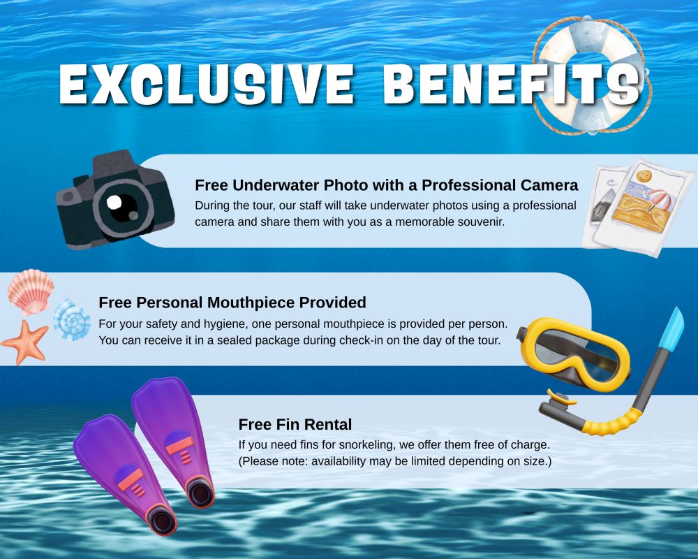 - 救生衣+浮潛裝備全套設置,不會游泳亦可