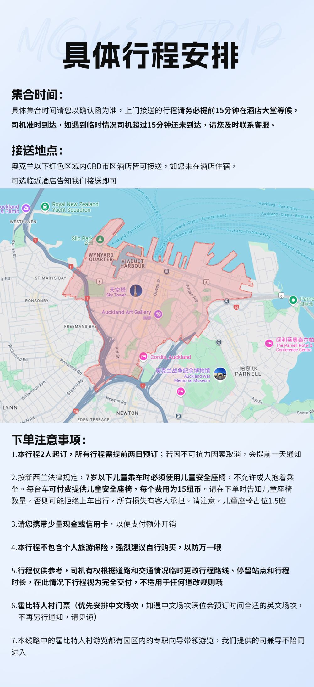 奧克蘭市區酒店可上門接送,如無法上門的地點,需要到就近集合地點集合上車。 下單後會給您上傳確認單,確認單上有司導的WeChat,請添加司導WeChat,出發前一天司導會告知您幾點接交通