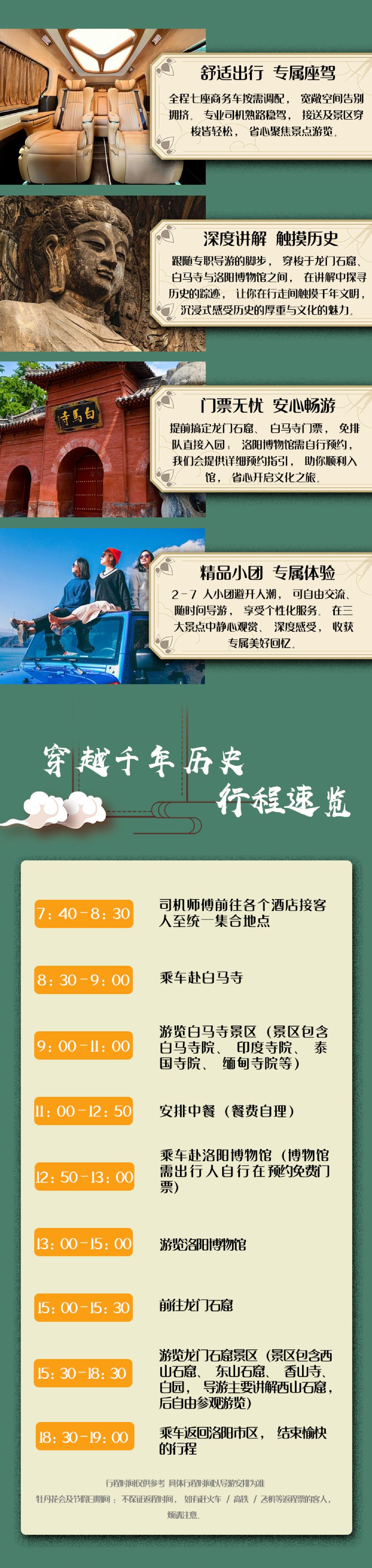 18:00 於洛陽下車 指定區域以外不提供接送服務 不含演出套餐的遊客行程結束後專車送回酒店或洛陽市區任意位置,行程當天可免費送高鐵站/火車站。
