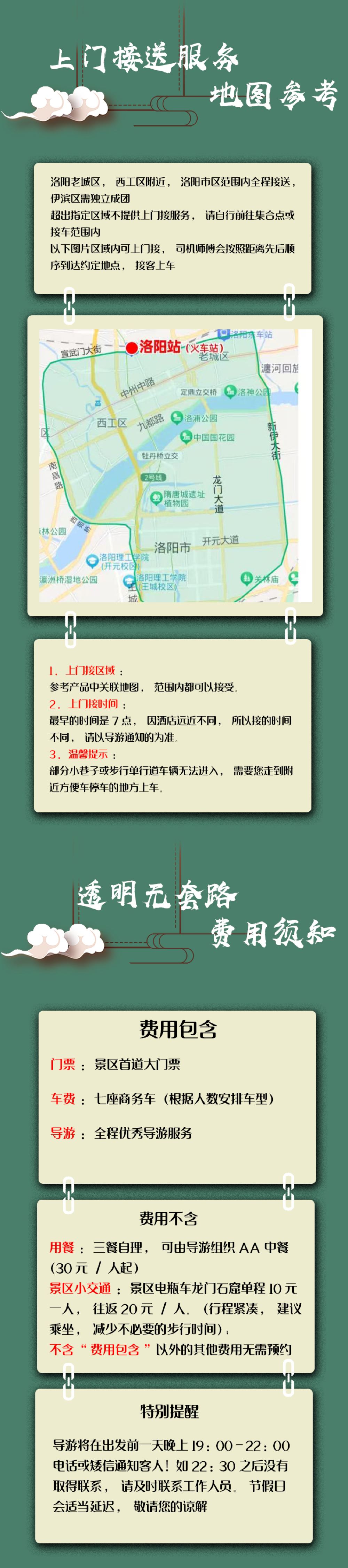 不含演出套餐的遊客行程結束後專車送回酒店或洛陽市區任意位置,行程當天可免費送高鐵站/火車站。