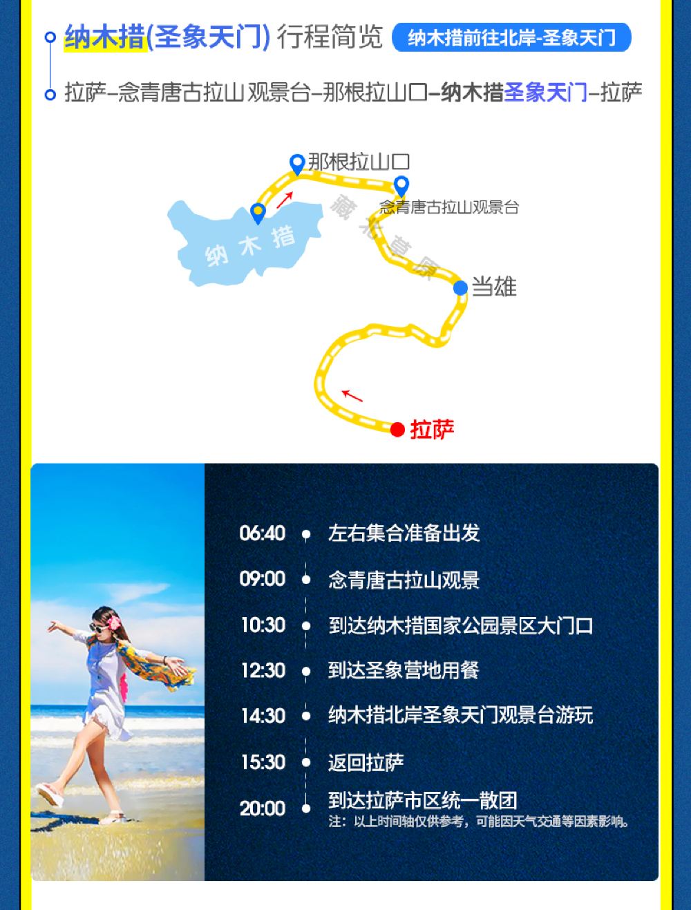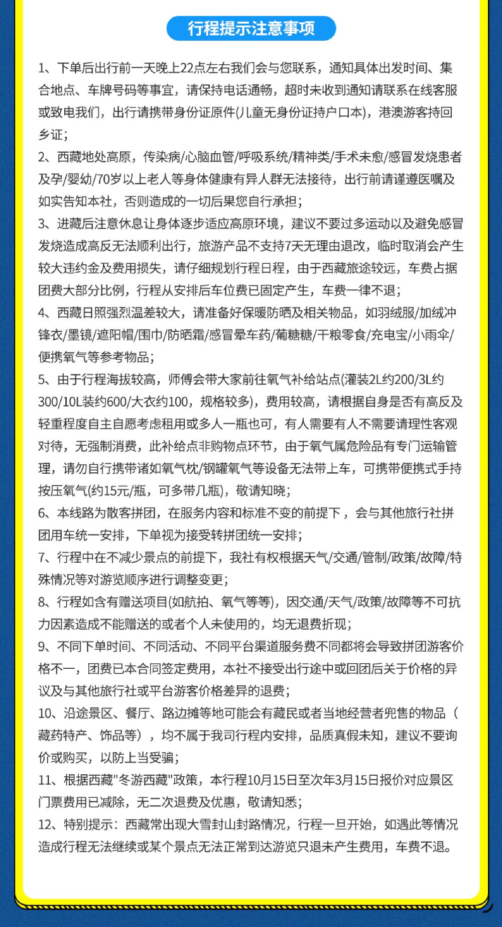 2、特別提示:納木措景區天氣變化較大且不穩定,經常出現大雪封山封路的情況。如遇此類不可抗力導致行程無法繼續,或臨時個人取消行程,均只退還未產生費用(扎西半島門票觀光車125元/人)。司機及車輛需提前安排,車費恕不退還,敬請知悉。