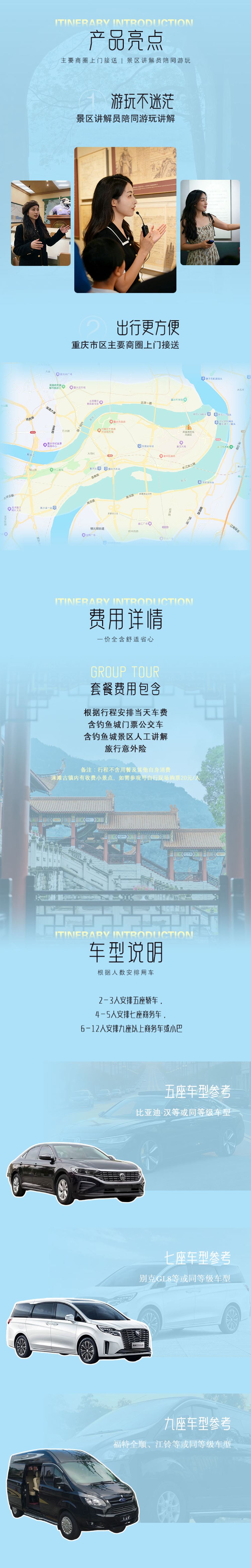 2.車型說明:2-3人安排5座轎車,4人可根據需求選擇5座或7座套餐,5-6人7座商務車,7人以上9-14座商務車或小巴。