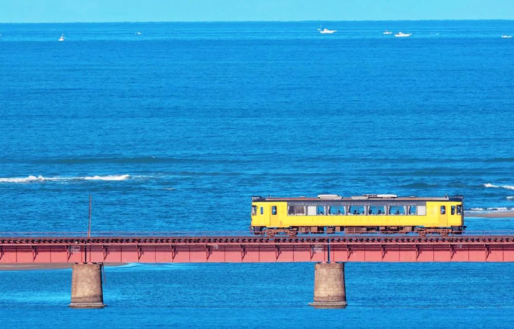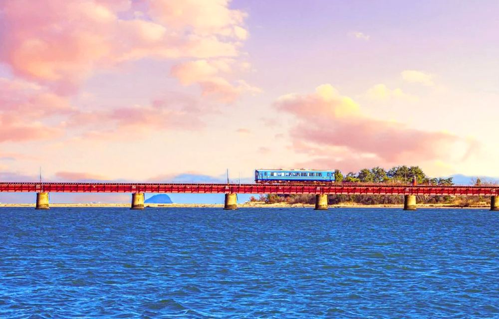 ▲ 【西舞鶴站*乘搭前往天橋立的海上列車】 (包含223D號列車費用,購票等候時間約20分鐘,乘搭時間約44分鐘) 列車經過由良川橋樑時,可欣賞到與吉卜力電影《千與千尋》同款的海上列車美景。列車緩緩駛過有「海上鐵道」之稱的由良川橋樑時,彷彿駛入《千與千尋》的世界,透過車窗望去,海天交融,恍如置身現實版的吉卜力童話。