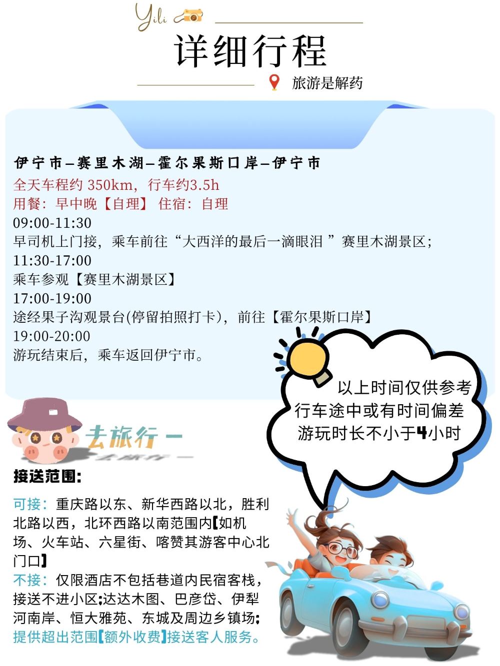 於指定地點接載09:00 伊寧市 於指定地點接載 預訂前請先確認酒店地址是否提供免費接送服務