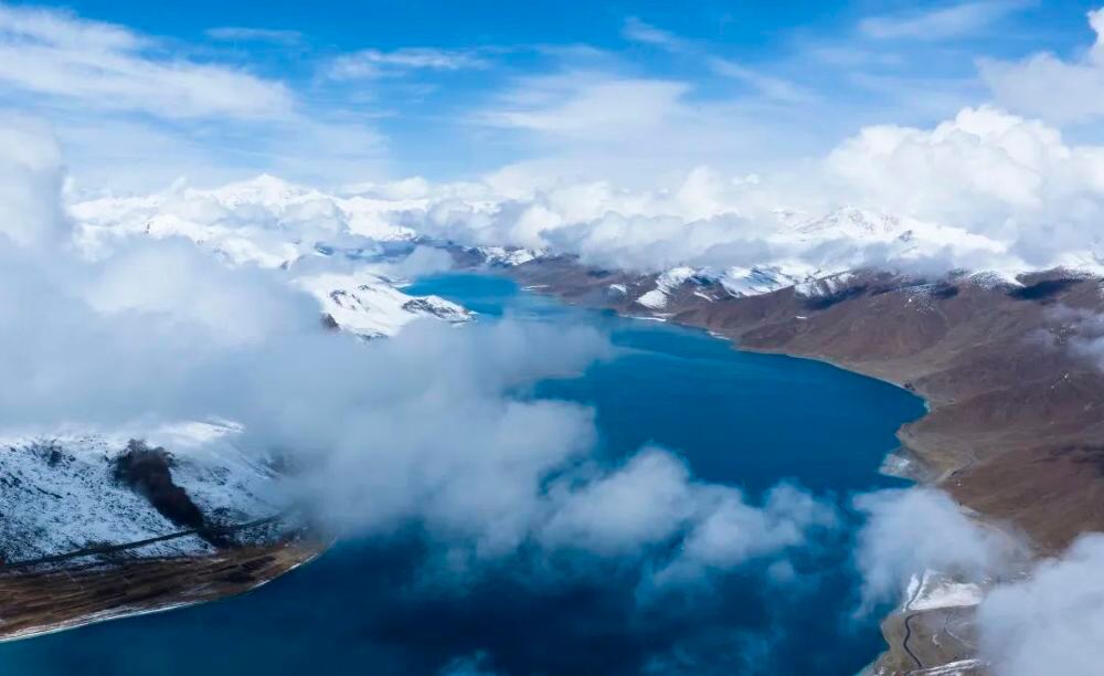 ▲ 從航拍視角展現的壯麗景觀。湛藍湖水如寶石般鑲嵌在大地,周圍雪山連綿,峰頂積雪皚皚,白雲繚繞山間,彷彿為山川披上輕柔薄紗,藍天襯托下,盡顯高原湖泊的雄渾與聖潔,勾勒出大自然鬼斧神工的優美畫卷。