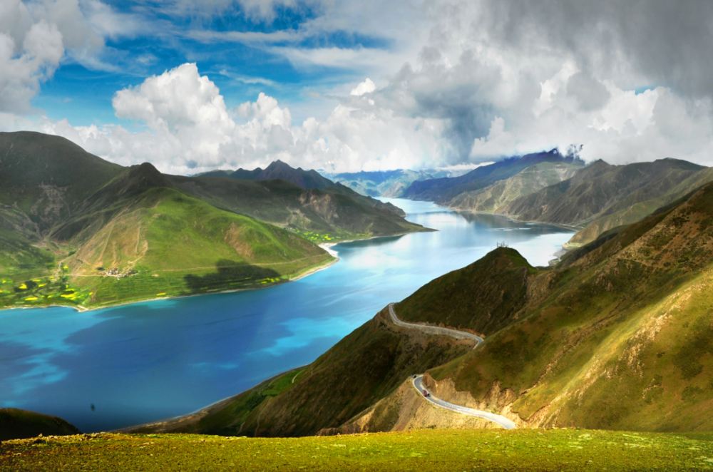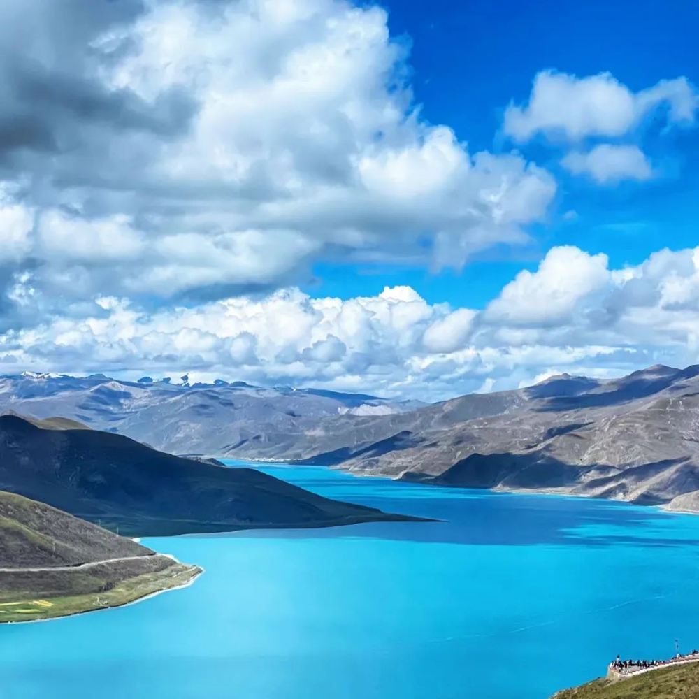 ▲ 這是西藏的羊卓雍錯湖(羊湖),湖水呈現出極為迷人的藍色,在藍天、白雲與連綿山脈的映襯下,顯得格外純淨。遠處山巒起伏,山頂有積雪,天空中雲朵形態各異,光影灑在湖面和山體上,營造出壯闊又靜謐的高原湖泊美景,盡顯大自然的雄渾與秀麗。