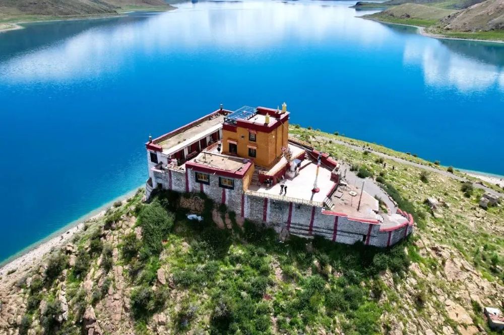 ▲ 日託寺位於西藏自治區山南市浪卡子縣,坐落在羊卓雍錯(羊湖)西南岸一座孤獨的小島上,小島與湖岸間有狹窄的土地相連,從遠處看,日託寺就像是漂浮在羊卓雍錯湖面上,遺世獨立。寺廟規模較小,建築緊湊。主體建築是一座上下兩層的白色小樓,外牆裝飾有紅色、黃色的線條,屋頂為傳統藏式風格。內部設有佛堂,供奉著佛像、唐卡等宗教物品,雖然規模不大,但內部的宗教陳設卻莊重而精美,充滿著濃厚的宗教氛圍。羊卓雍錯湖水湛藍清澈,圍繞著日託寺所在的小島,無論從哪個角度看,都是一幅如詩如畫的風景。