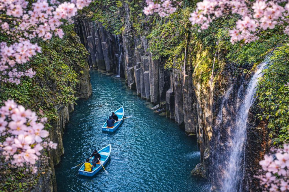 ▲ 高千穗峽:傳說中天照大神隱居之地,峽谷幽深、碧水潺潺。在寧靜的高千穗峽谷中,乘坐遊船緩緩劃過碧綠溪水,兩岸峭壁間飛瀑傾瀉,水霧輕拂臉龐,彷彿走入神話長卷。(一艘遊船可以乘坐3人)