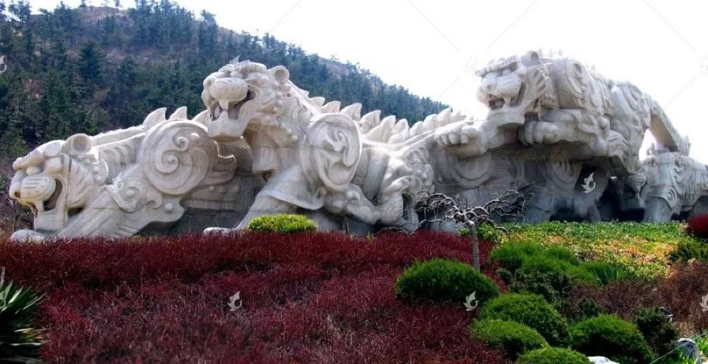 ▲ 大連市眾多廣場中最為絢麗的一座廣場。它由500塊花崗岩大理石精雕而成,重達2,000多噸。6隻形態各異的老虎,頭向東方,迎風長嘯,虎虎生威。虎雕廣場是由我國畫家、雕塑家韓美林設計。它是在全國最大的花崗岩石雕——群虎雕塑的基礎上修建而成,它將怪石、奇石立於種植的花草樹木之中,給人一種新穎奇特的視覺享受。