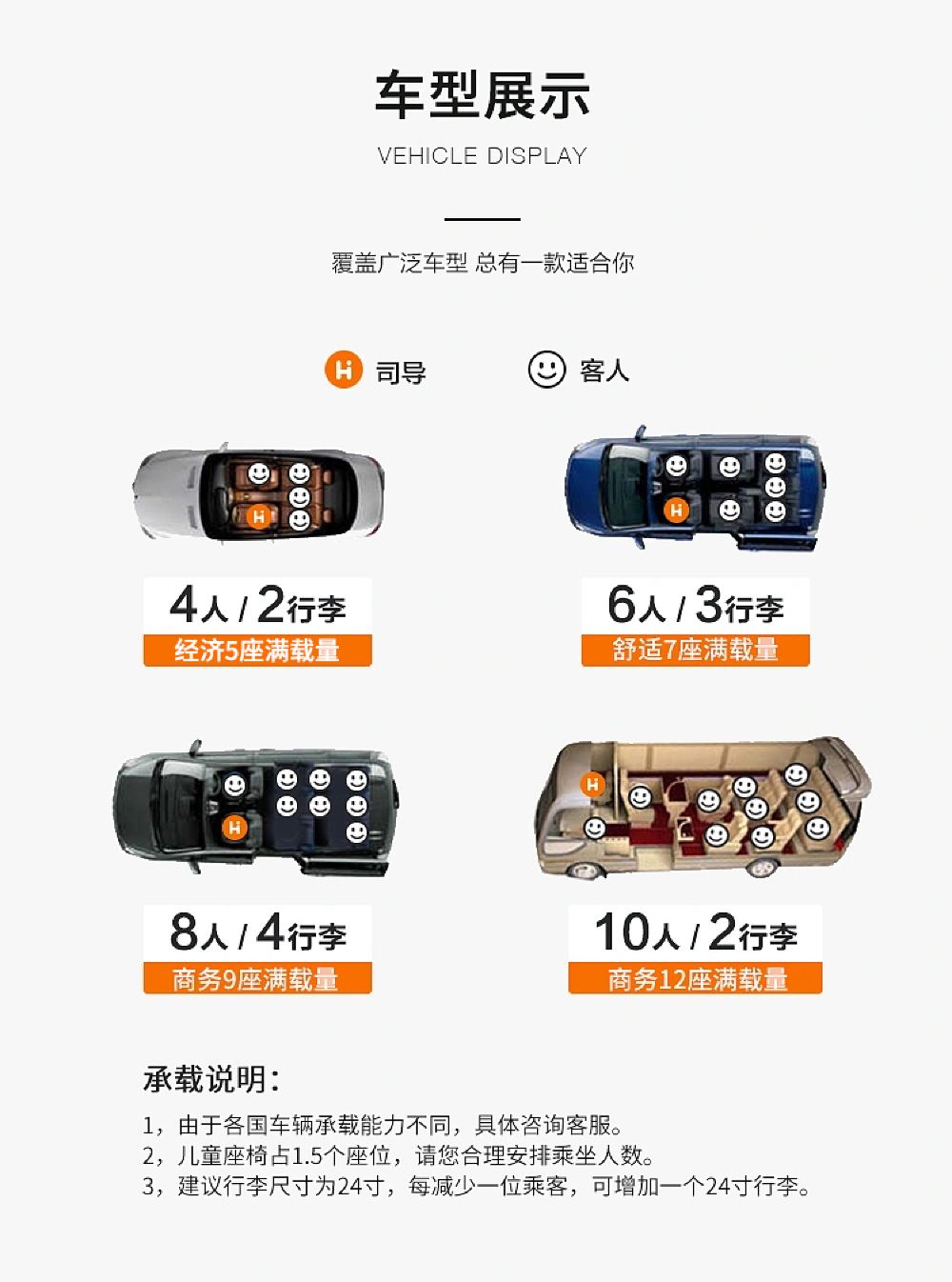 - 5座/7座/9座車型,滿足情侶、家庭、朋友出遊不同需求