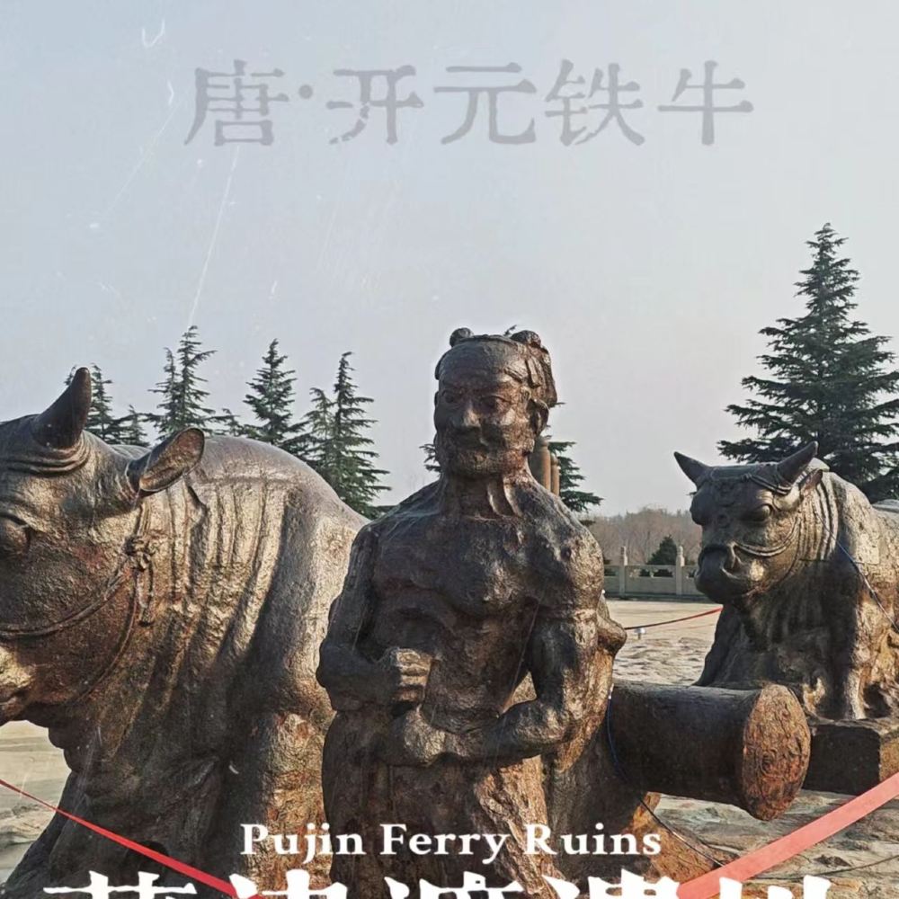 ▲ 春秋時期起,此處已是秦晉交通要道,公元前541年已有浮橋記載;唐開元十二年(724年),玄宗命張說主持,鑄造鐵牛、鐵人作地錨,建鐵索連舟浮橋,堪稱盛唐超級工程;元末橋毀,鐵牛深埋;1989年正式發掘出土;2001年列入全國重點文物保護單位。