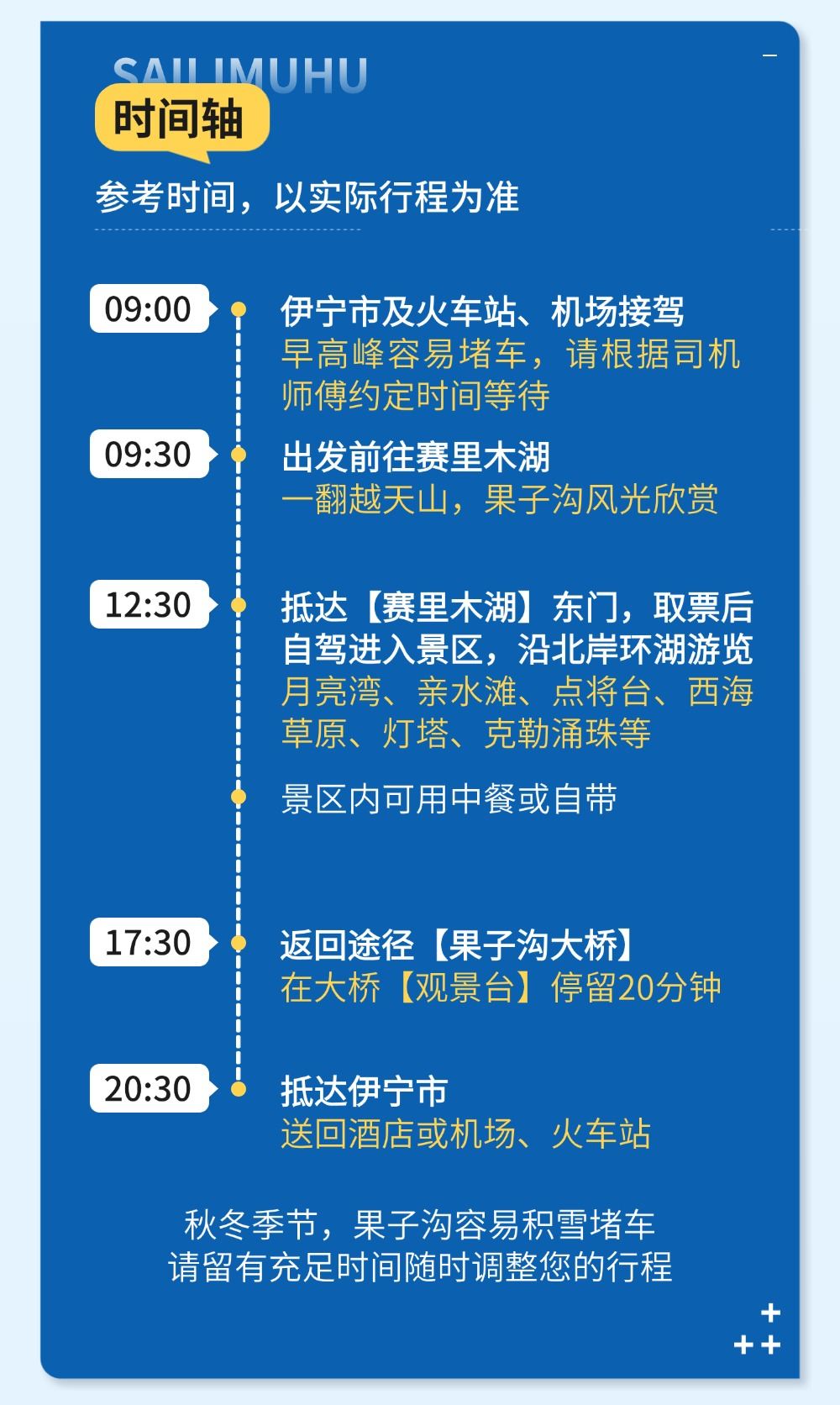 20:30 於伊寧市下車 指定區域以外不提供接送服務 市區免費送回服務(包括機場、火車站)