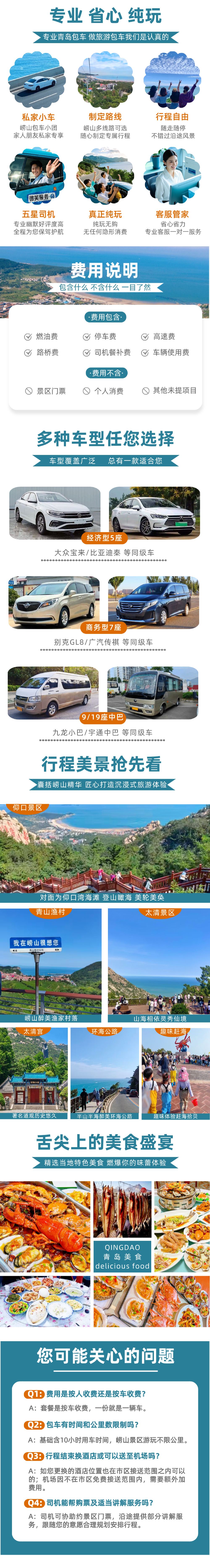 A-嶗山5座車(4人以內拍一份) | 標準車型(5座) | 普通話 | 提供去程接送 | 獨立包團 | 4位旅客 | 司機及遊覽講解 | 不包括餐膳 | 回程接送