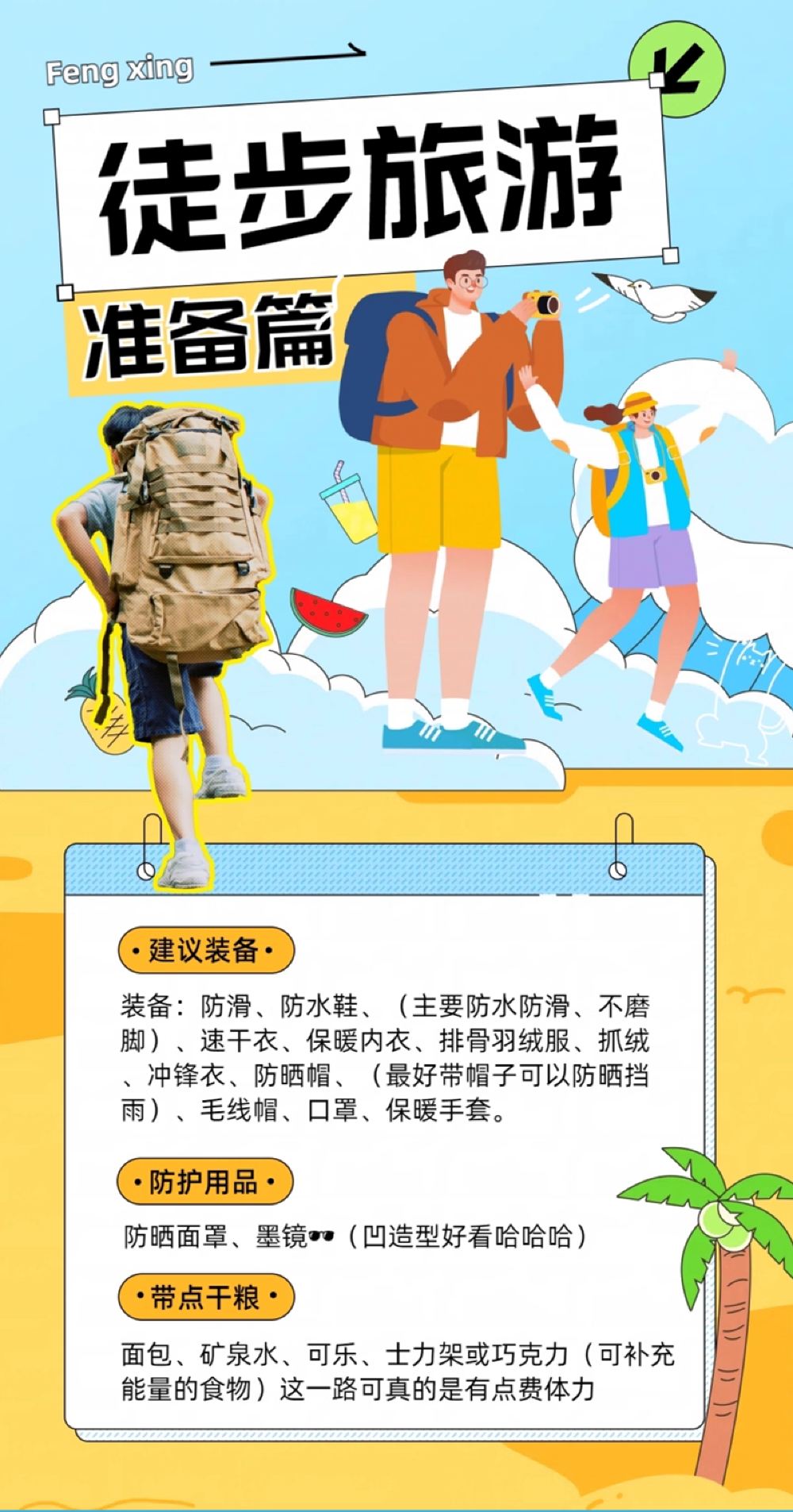 身份證、護照或身份證、其它身份證明文件、防曬霜、食物和飲料、移動充電器、個人葯物、不露趾的鞋子、太陽鏡、太陽帽、舒適的鞋子、適合天氣的衣物、雨具、相機