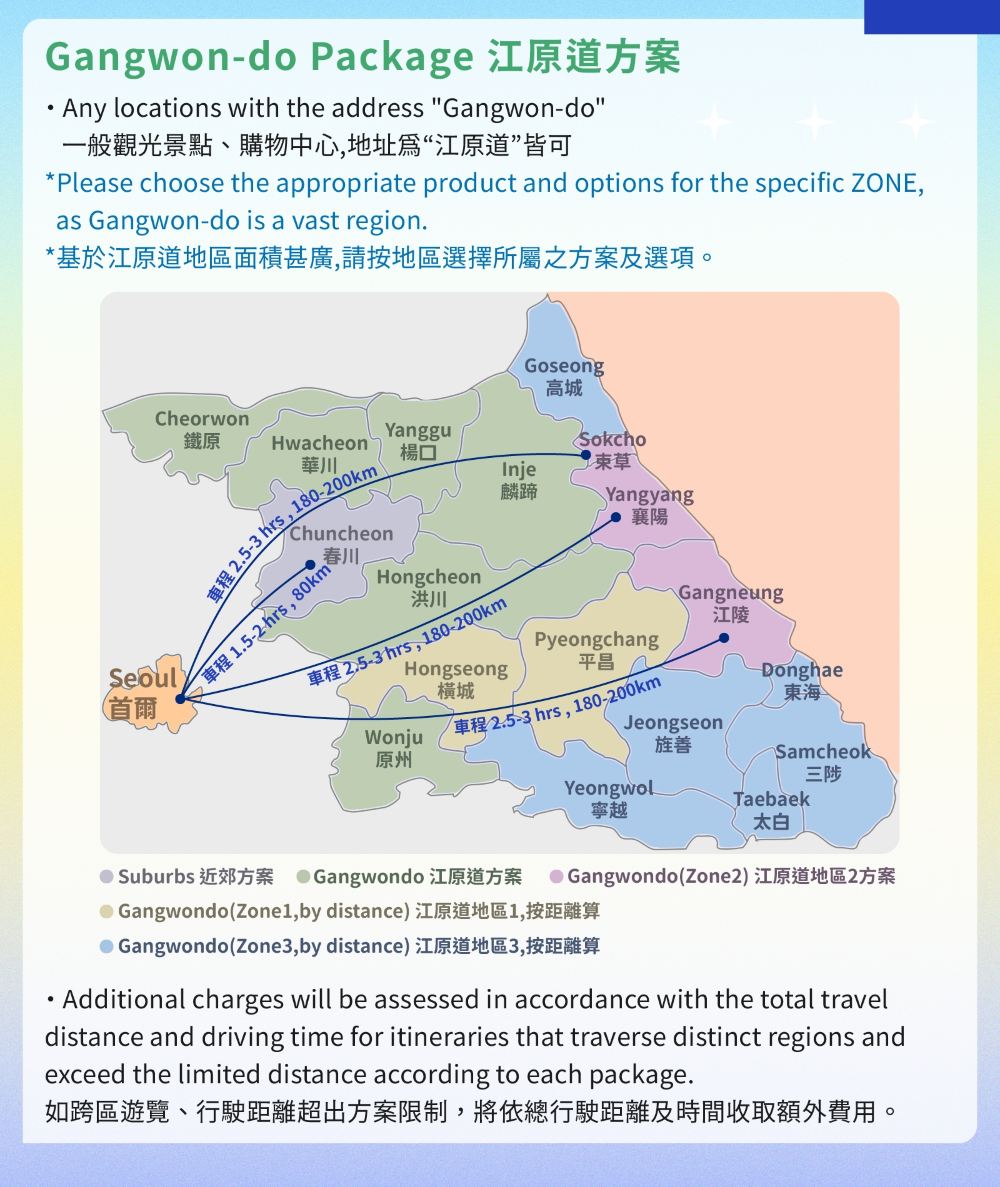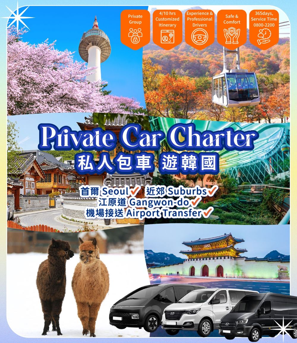 ▲ 指定區域外可提供回程接送服務,首爾市以外地區下車需按地區額外收費 超時服務:KRW 25,000 / 每小時;服務時間包含司機返回首爾時間,如您想在首爾以外的任何地方下車,將算在超時服務範圍內。由預約上車時間開始計算10小時的包車服務 **如客人遲到或突然改行程時間,時間也計算在內** *行程時間以遊覽地點的當地時間為準,可能另因為天氣條件、路況及其他因素而有所變動。感謝您的諒解。