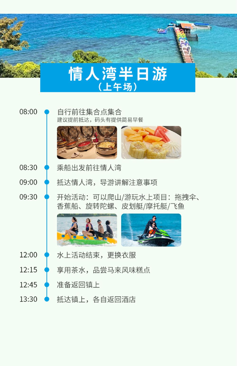 上午場:8:00集合--13:00回到碼頭 下午場:13:00集合-17:45回到碼頭早餐