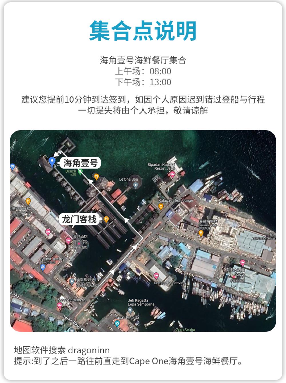 在集合地點集合08:00 仙本那 仙本那海洋旅遊中心 集合 上午場:8:00集合--13:00回到碼頭 下午場:13:00集合-17:45回到碼頭