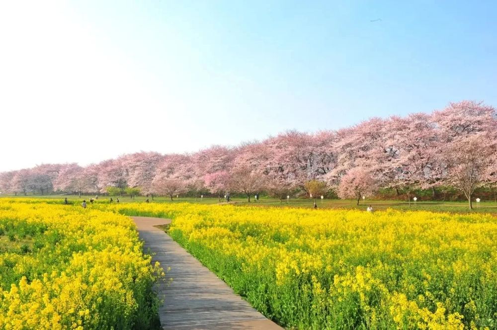 - 賞花逛街輕鬆遊,粉紅櫻花與金黃油菜花相互映襯,美不勝收