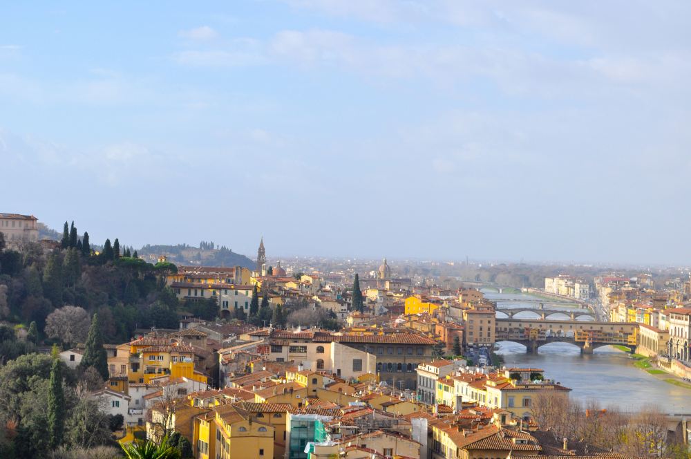 ▲ 連片紅瓦屋頂裹着老城,阿諾河淌過城心,老橋(韋奇奧橋)的廊橋建築醒目地跨在河上,幾座石橋連起兩岸,晴光裏浸着佛羅倫斯的中世紀慵懶暖意。