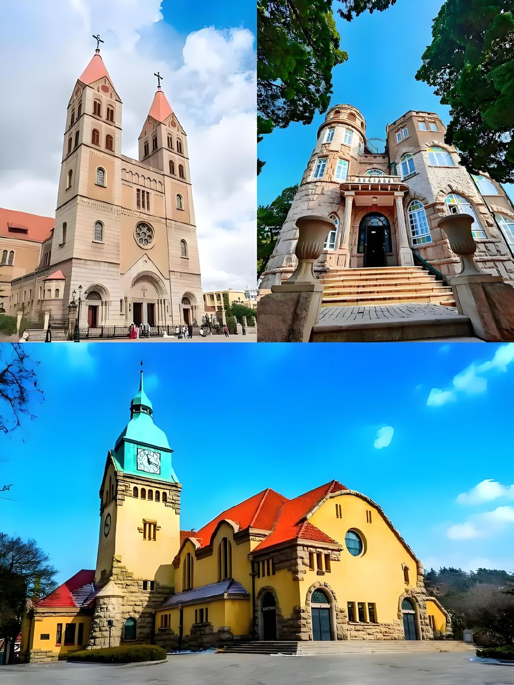 ▲ “願神明偏愛,一切從歡” 【天主教堂】-島城Citywalk必打卡。又稱聖彌厄爾大教堂,由德國設計師畢婁哈依據哥德式和羅馬式建築風格設計。是建國前山東省的建築,是中國祝聖教堂。蔚藍天空下,教堂平面呈十字型,兩側有兩座對稱而又高聳的鐘塔,塔內部有4個巨大銅鐘,鐘聲悠揚和諧。 (外觀,無需入場門票)。